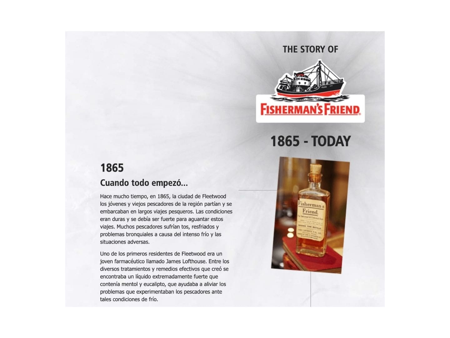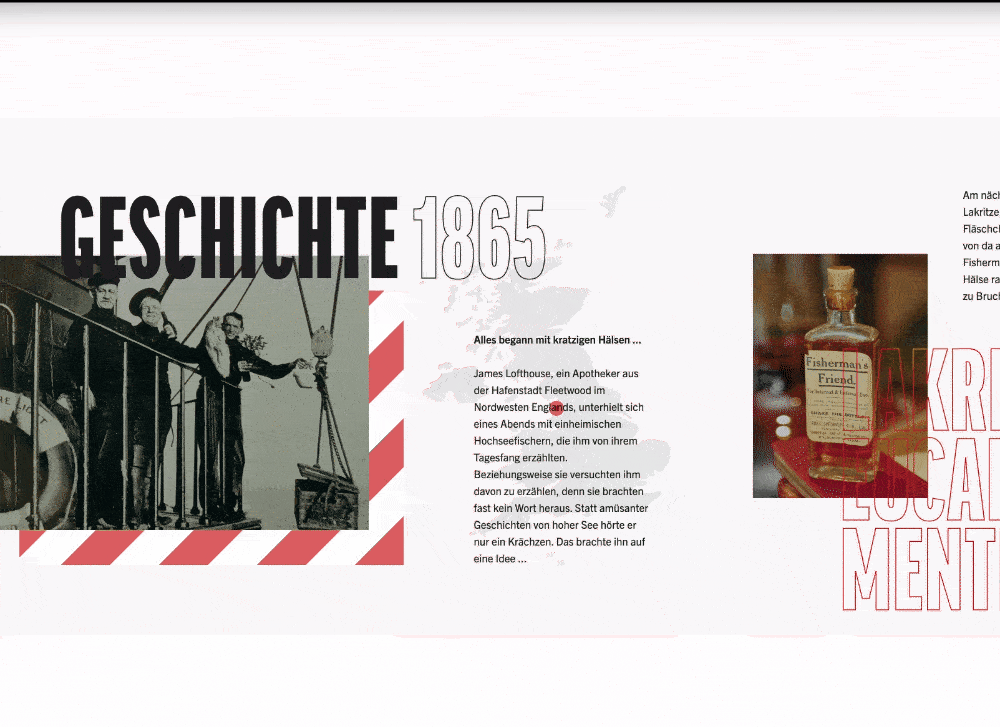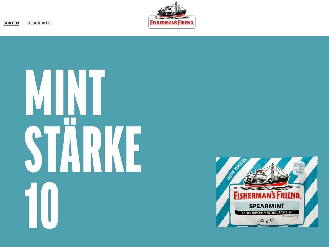 Die Menthol-Pastillen der Marke Fisherman’s Friend waren vor 166 Jahren ihrer Zeit voraus und sind heute immer noch mehr als zeitgemäß. Die imposante Geschichte und die „Freshness“ der Marke müssen daher genauso innovativ transportiert werden. Eine animierte History Section mit horizontalem Scrolling und der Einsatz diverser Storytelling-Elemente schaffen das eindrucksvoll.
