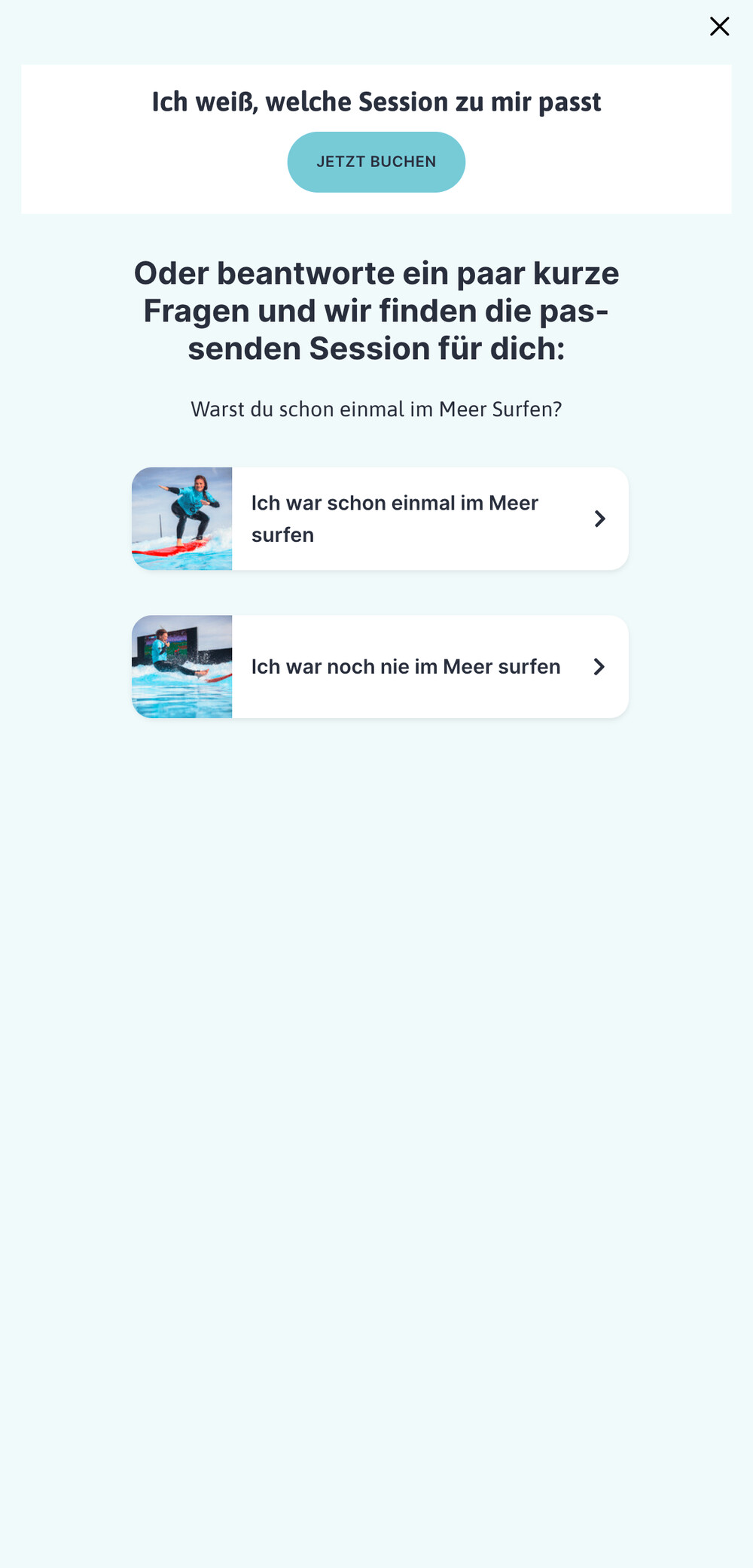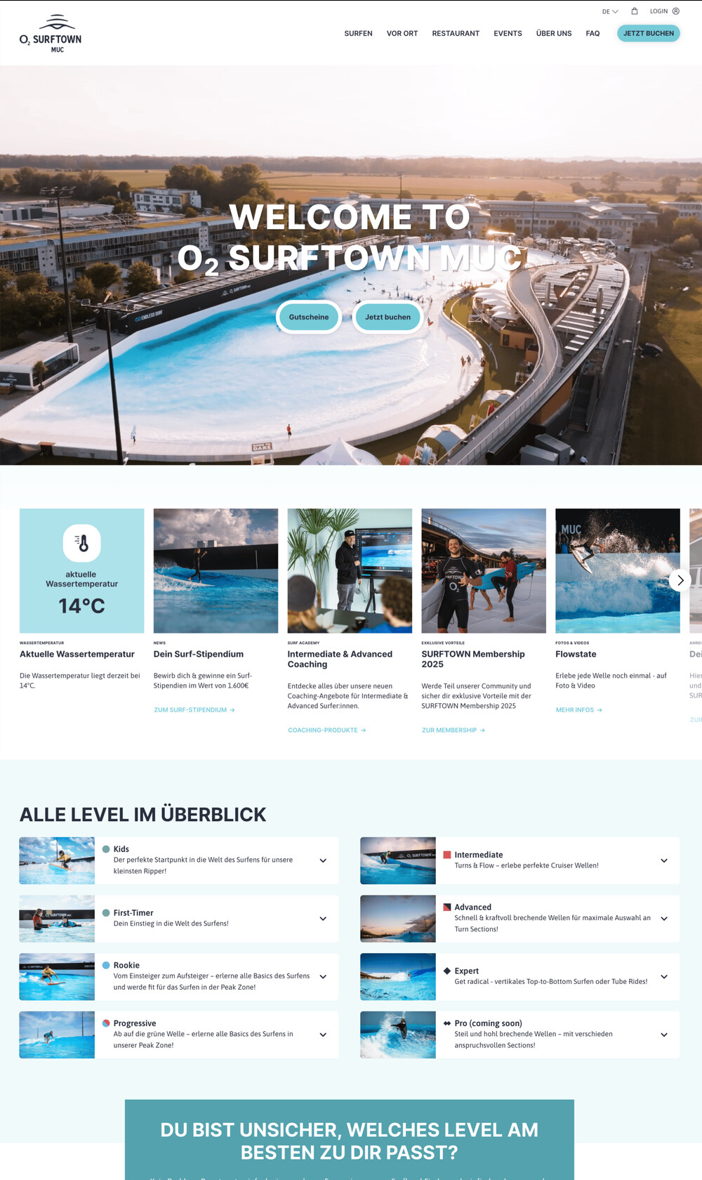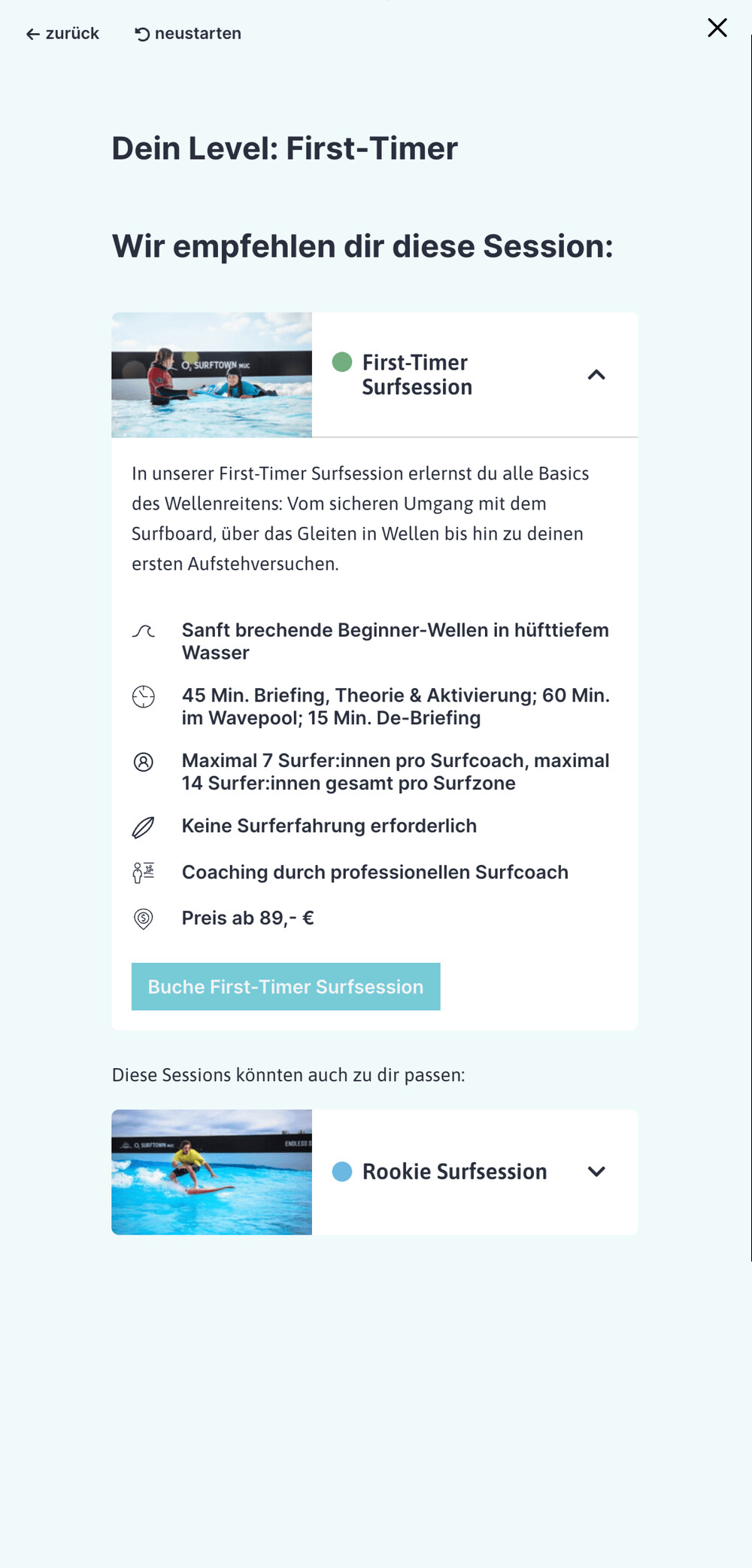 Der Surf Level Finder steht zentral im Buchungsprozess zur Hilfe, aber drängt sich nicht auf.