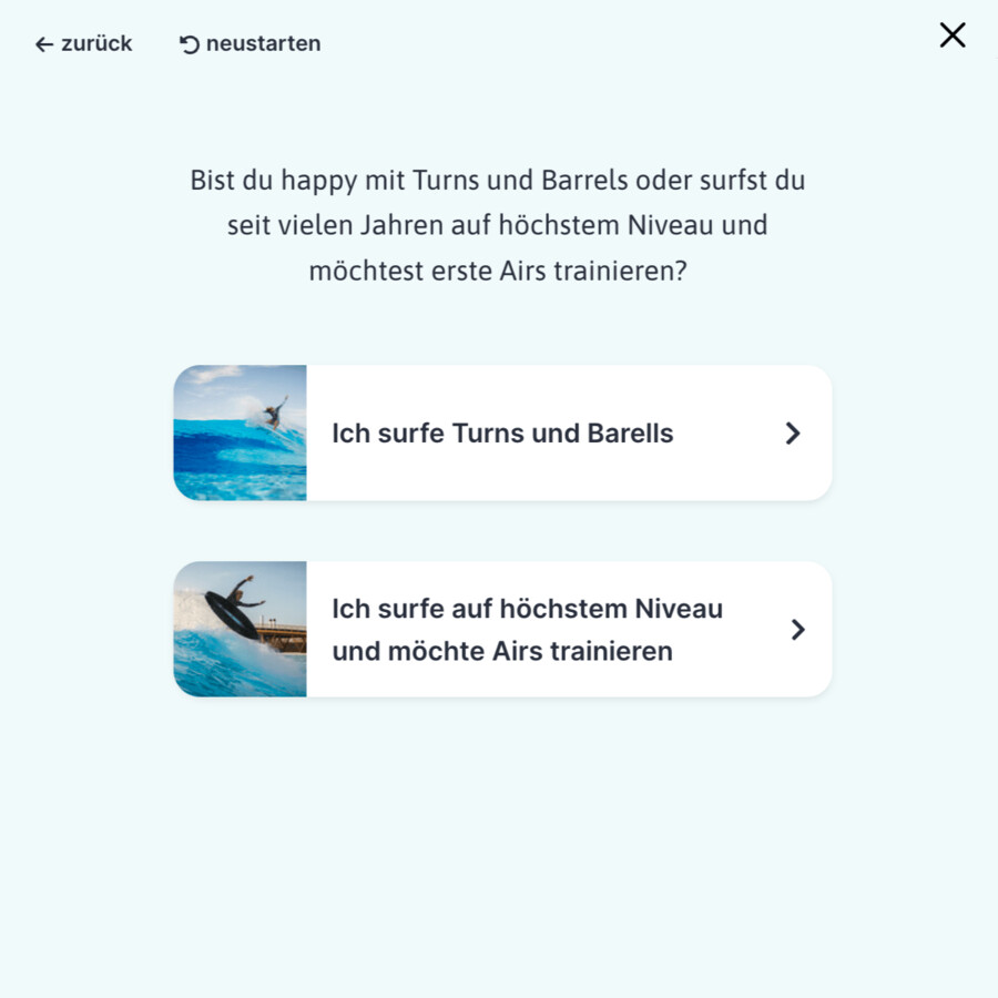 Der Surf Level Finder stellt nacheinander Fragen zur Surf-Erfahrung und unterstützt den Kauf des passenden Levels